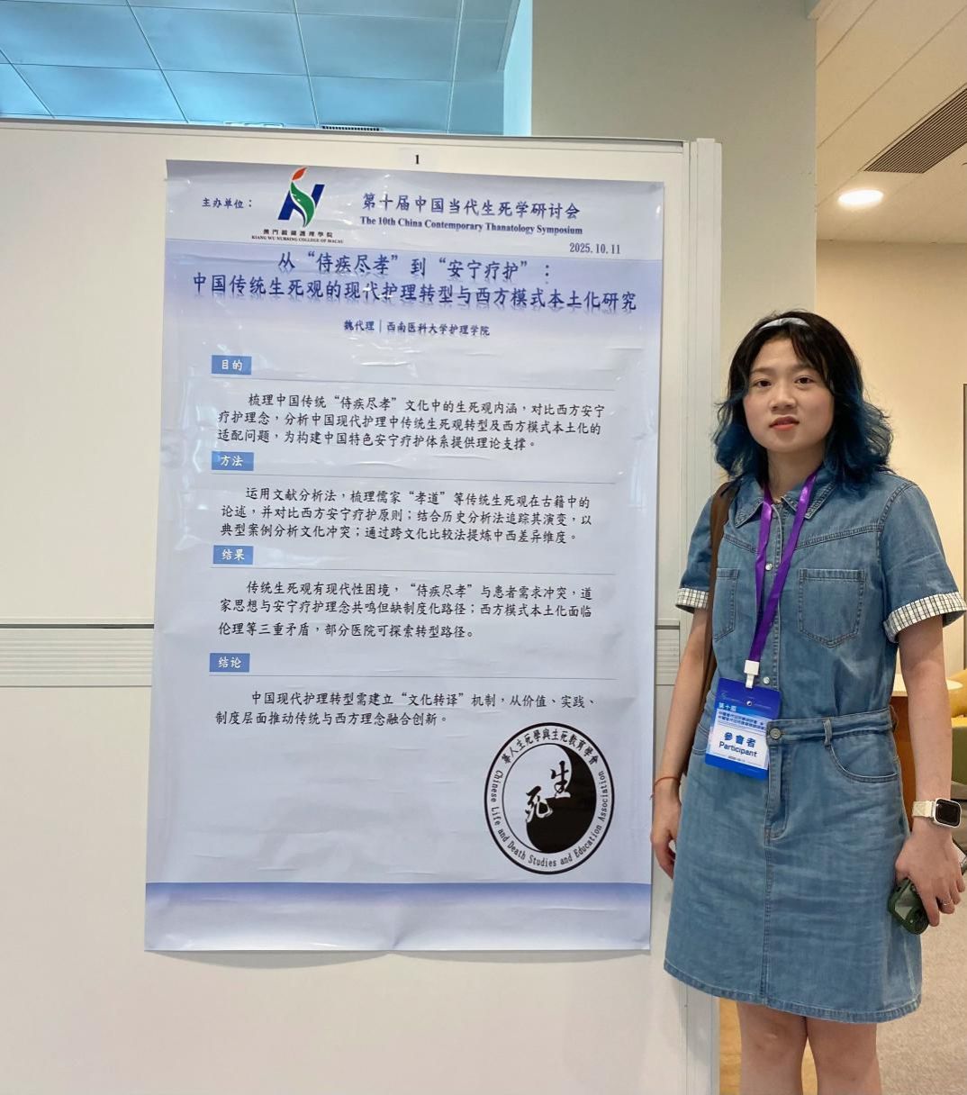 魏代理同学通过壁报形式展示了题为《从“侍疾尽孝”到“安宁疗护”:中国传统生死观的现代护理转型与西方模式本土化研究》的学术成果。该研究深入阐释了中国传统“侍疾尽孝”文化中的生死观内涵,通过系统比较西方安宁疗护理念,分析了传统生死观在现代护理实践中的转型路径及西方模式本土化的适配策略,为构建具有中国特色的安宁疗护体系提供了重要的理论支撑。