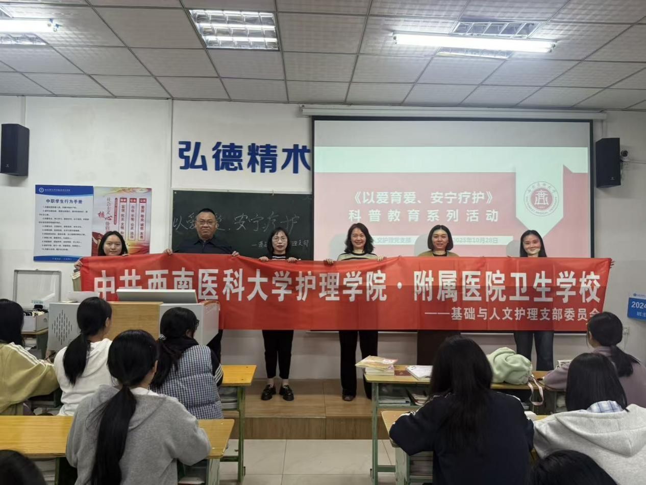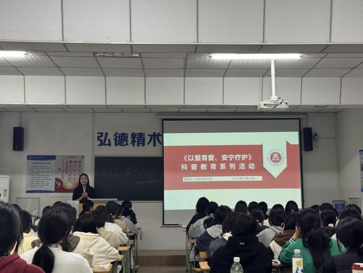 为持续深化人文关怀育人实践、推动安宁疗护走进课堂与临床,基础与人文护理党支部于10月28日在忠山校区301教室举办“以爱育爱,安宁疗护”科普教育系列活动。活动以专题讲座、互动答题与现场交流等形式,引导师生共同思考“善别善终”的价值与实践路径,获得到场同学一致好评。