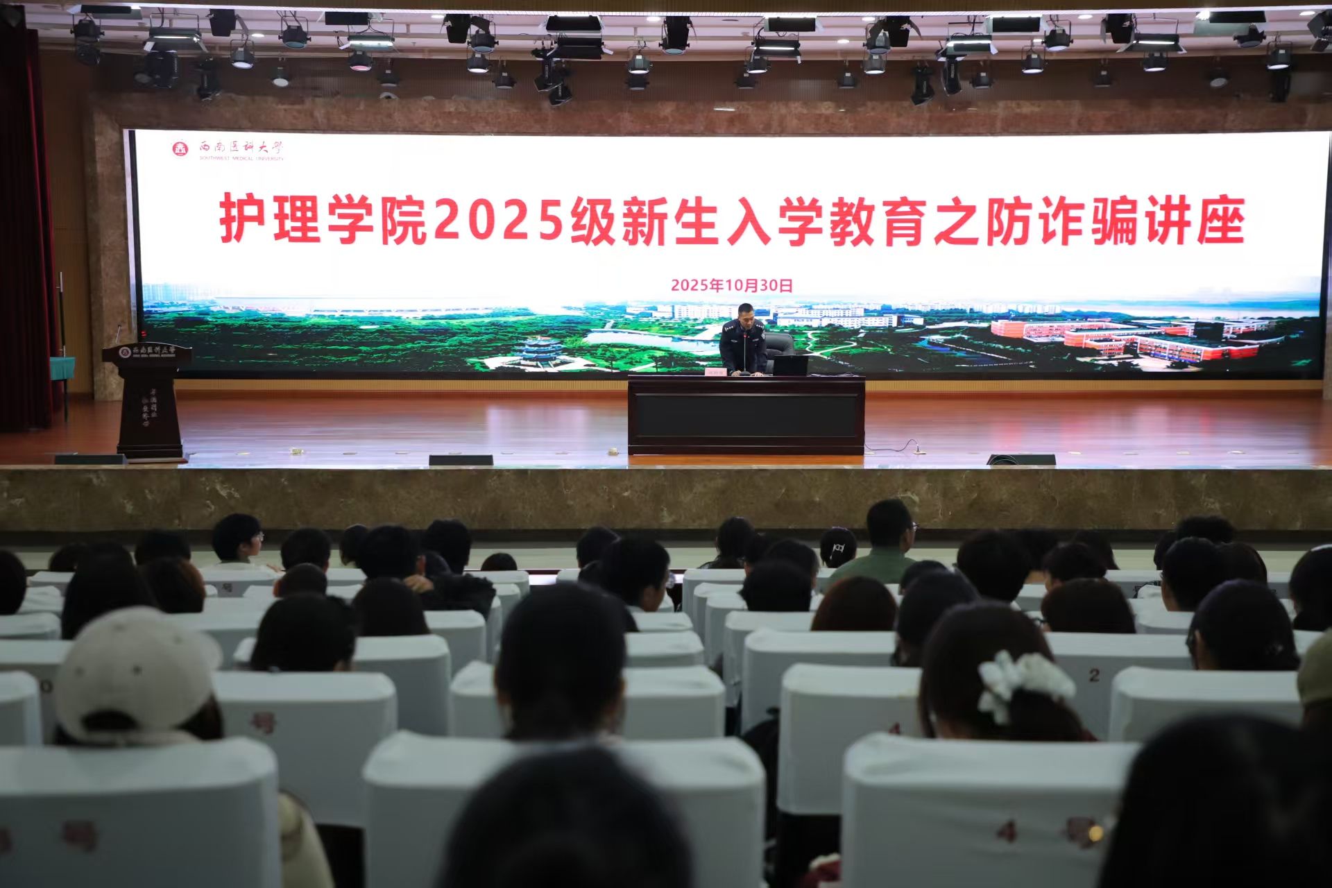 为进一步增强新生财产保护意识,树立“不轻信、不透露、不转账”的安全防范意识,提高新生识诈防诈能力,10月30日晚,护理学院在城北校区第一学术报告厅举行2025级本科新生入学教育之防诈骗主题讲座。本次讲座特邀泸州市红星派出所驻校民警赵卿辉警官宣讲,护理学院新生辅导员及2025级全体新生共400余人参加。讲座由2025级辅导员张瑞主持。