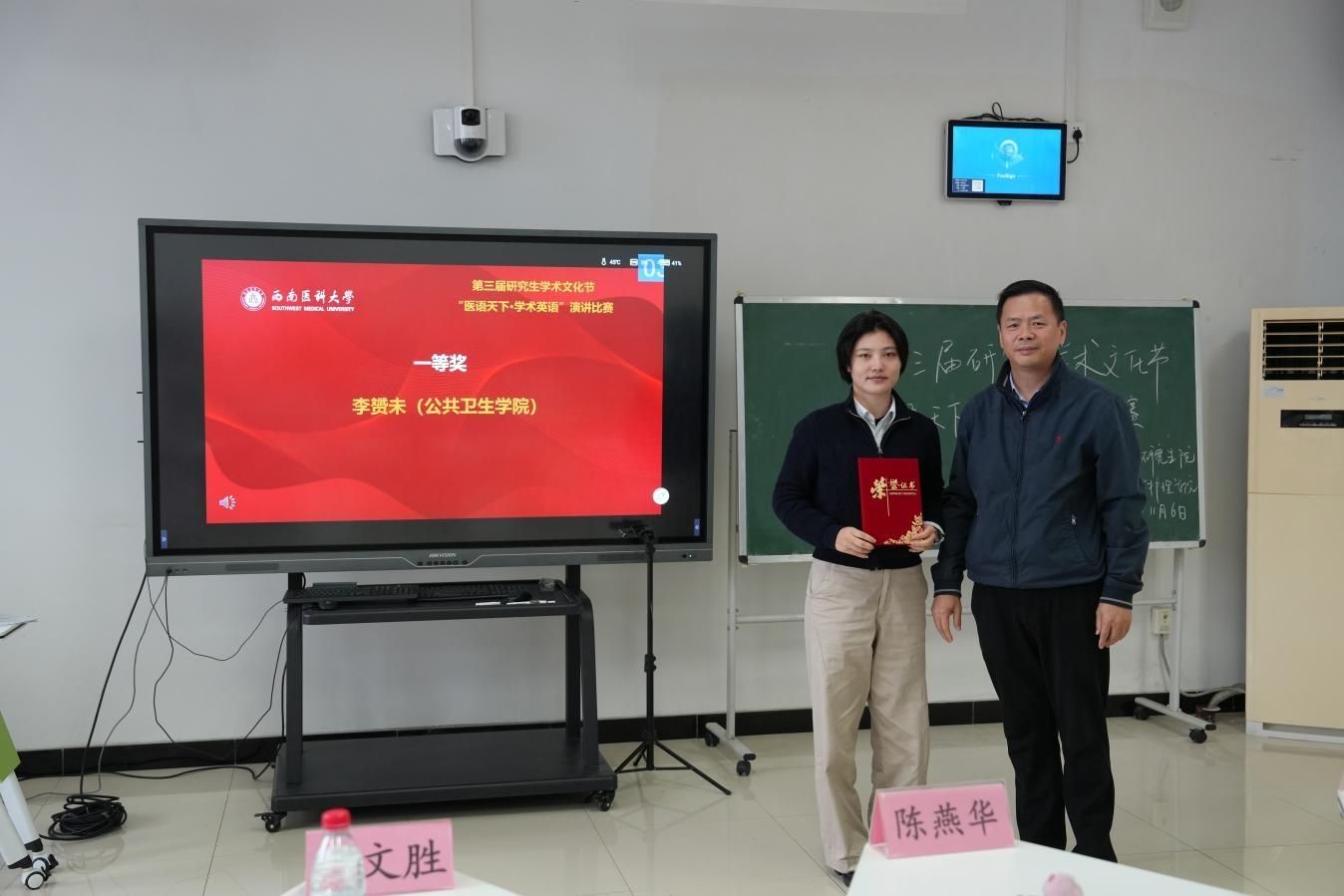 评分环节严格按照学术内容、语言表达、演讲技巧及答辩表现四个维度进行,由评委组现场打分。经过激烈角逐,公共卫生学院李赟未凭借扎实的学术素养、流利的英语表达与出色的答辩表现荣获一等奖;护理学院郑钦莲、临床医学院张涵获得二等奖;口腔医学院万海因、护理学院王燕琪、口腔医学院马千里获得三等奖;护理学院薛峰旺、崔静获评优秀奖。