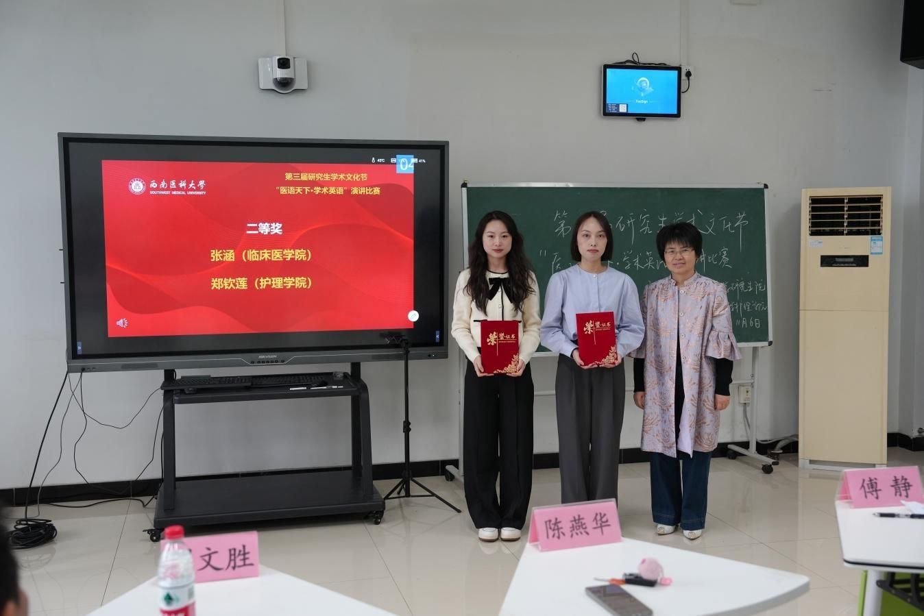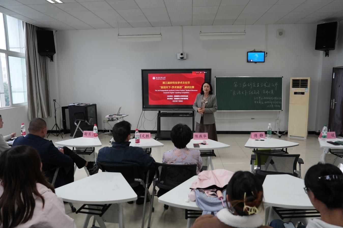 2025年11月6日上午,由西南医科大学研究生院主办、护理学院承办的第三届研究生学术文化节“医语天下·学术英语”演讲比赛决赛在海川楼5-8智慧教室顺利举行。护理学院院长陈燕华、党委书记刘文胜、副院长谢长友、科技处社会科学管理科科长代凤玲、研究生院学生科科长余媛出席活动,在校硕士研究生代表60余人现场观摩。活动由护理学院学科办副主任曾静媛主持。