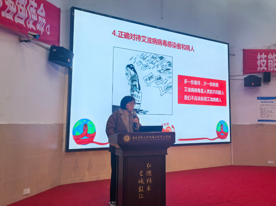 讲座伊始,纳溪校区教务学工党支部书记肖艳点明活动主旨,强调青少年防艾工作的重要性,希望通过讲座帮助师生科学防艾、包容感染者,共建安全校园。随后,简丽萍老师结合最新数据与案例,讲解艾滋病流行现状、医学常识及“性接触、血液、母婴”三大传播途径,纠正认知误区,重点传授洁身自爱、规范用血等防护措施,普及检测与帮扶政策。现场还组织观看防艾宣传视频,强化学习效果。