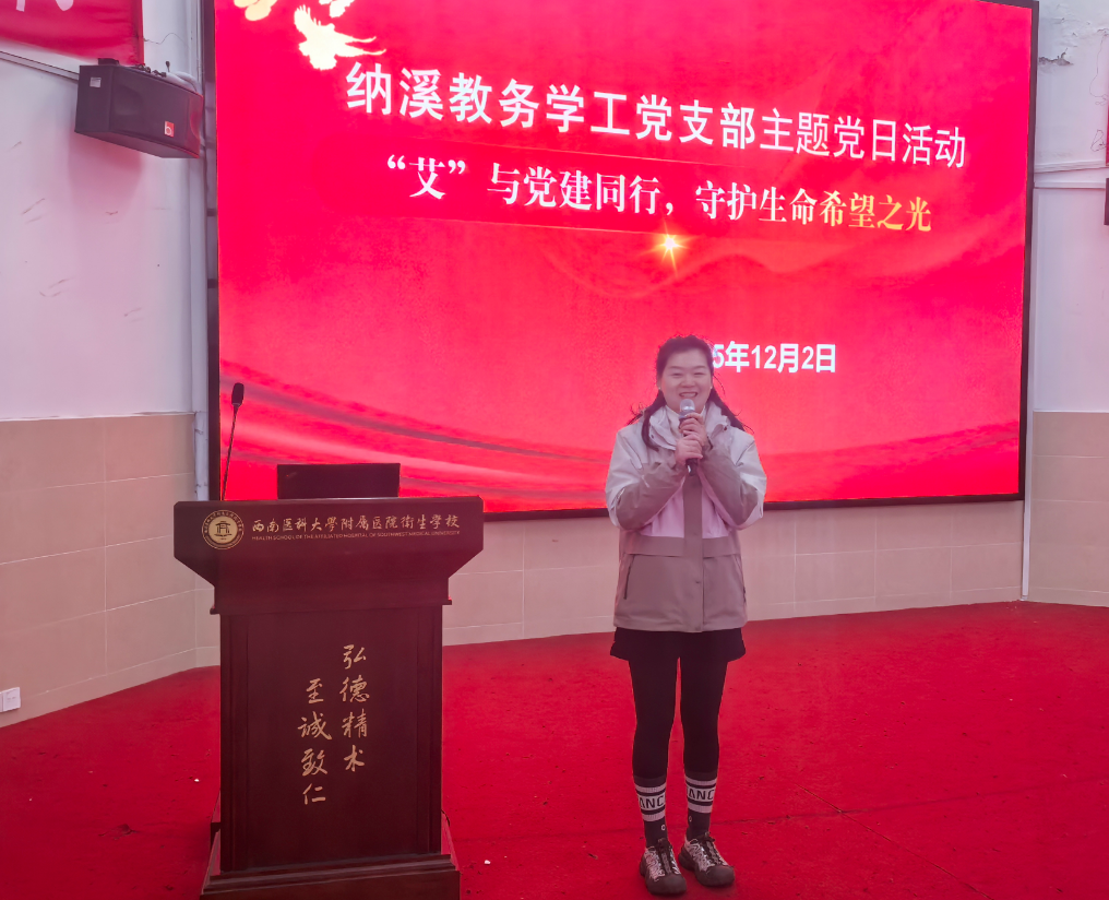 12月2日上午,护理学院·附属医院卫校纳溪校区教务学工党支部联合综合护理与研究中心党支部、后勤保卫党支部、忠山校区党支部,开展“防艾于未然”专题知识讲座。综合护理与研究中心党支部简丽萍老师主讲,校区师生代表现场聆听学习。