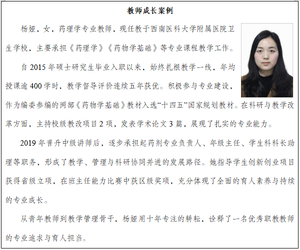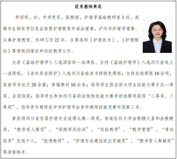 在教学竞赛获奖方面,朱琳、李茂萍、刘映宏三位教师参加四川省护理学会2025年高等护理本科院校青年教师临床护理技能竞赛,荣获二等奖;邓淑霞、杨美芳两位教师参加泸州老窖“金教鞭”奖比赛,获评“金教鞭奖”;胡月教师参加泸州老窖“金教鞭之星”奖比赛,获评“金教鞭之星”奖;郭辉梦、山李两位教师参加西南医科大学2025年度课堂教学创新大赛,分别荣获二等奖、三等奖;杨美芳、傅静、张璐三位教师参加2025年四川省教师数字素养实践活动,获常规项目课件一等奖;杨美芳教师参加2025年四川省首届教师人工智能应用能力大赛,荣获特等奖;龙霞教师参加四川省护理学会2025年重症监护护理会议说课比赛,荣获优秀奖;罗珊教师参加四川省第三届学生职业规划大赛课程教学赛道,荣获铜奖。