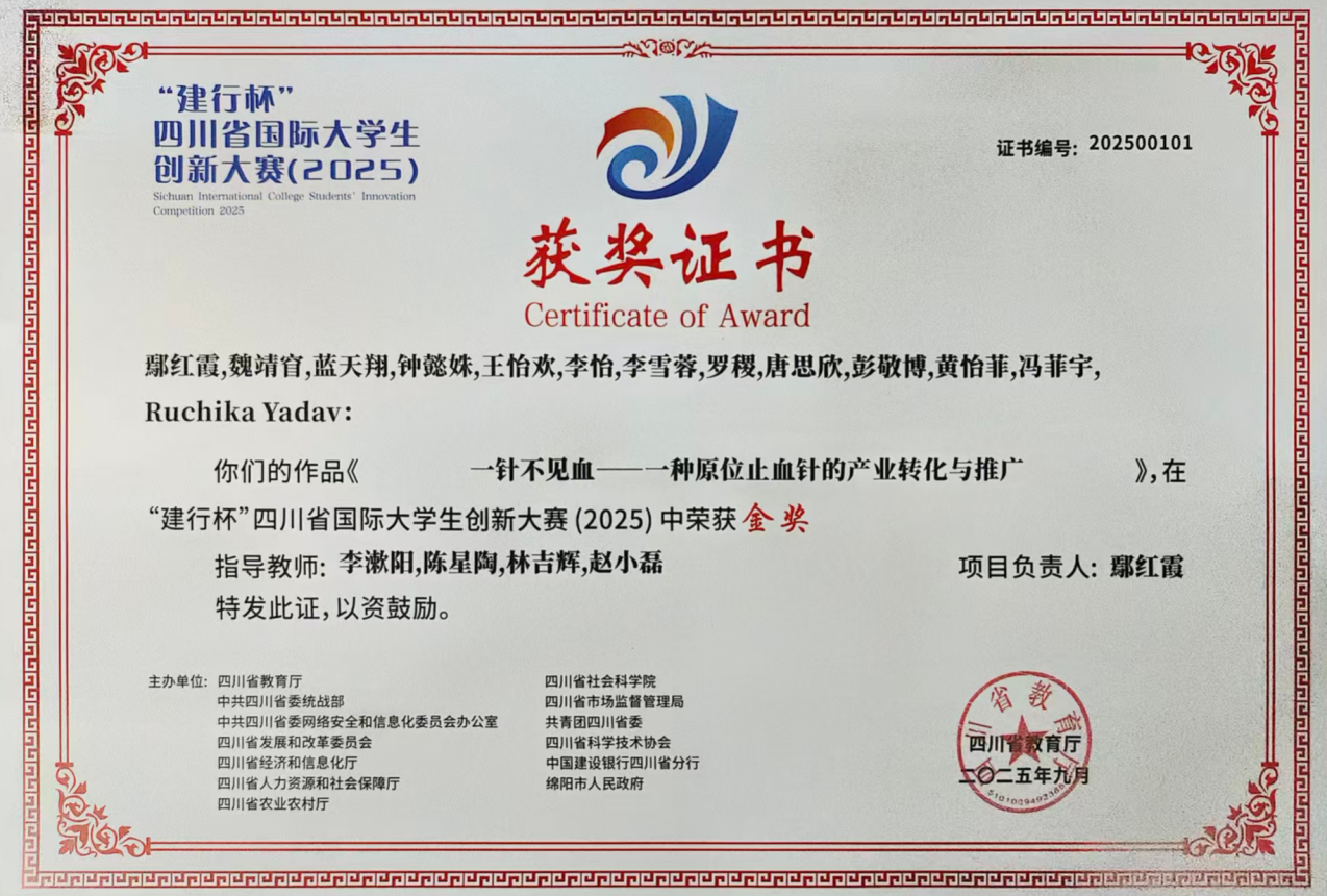 近日,中国国际大学生创新大赛(2025)结果揭晓。我校护理学院2023级本科生鄢红霞团队完成的创新项目《“一针不见血”——一种原位止血针的产业转化与推广》荣获国家级铜奖和省级金奖。该项目由李漱阳、陈星陶、林吉辉、赵小磊四位老师指导。