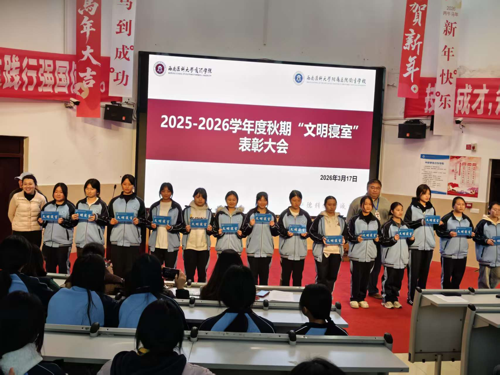 为营造整洁有序、安全和谐、温馨向上的宿舍育人环境,强化学生行为习惯养成,增强集体荣誉感,近日,我校举行2025年秋期文明寝室表扬大会,对在寝室文明建设中表现优异的集体予以通报表扬。