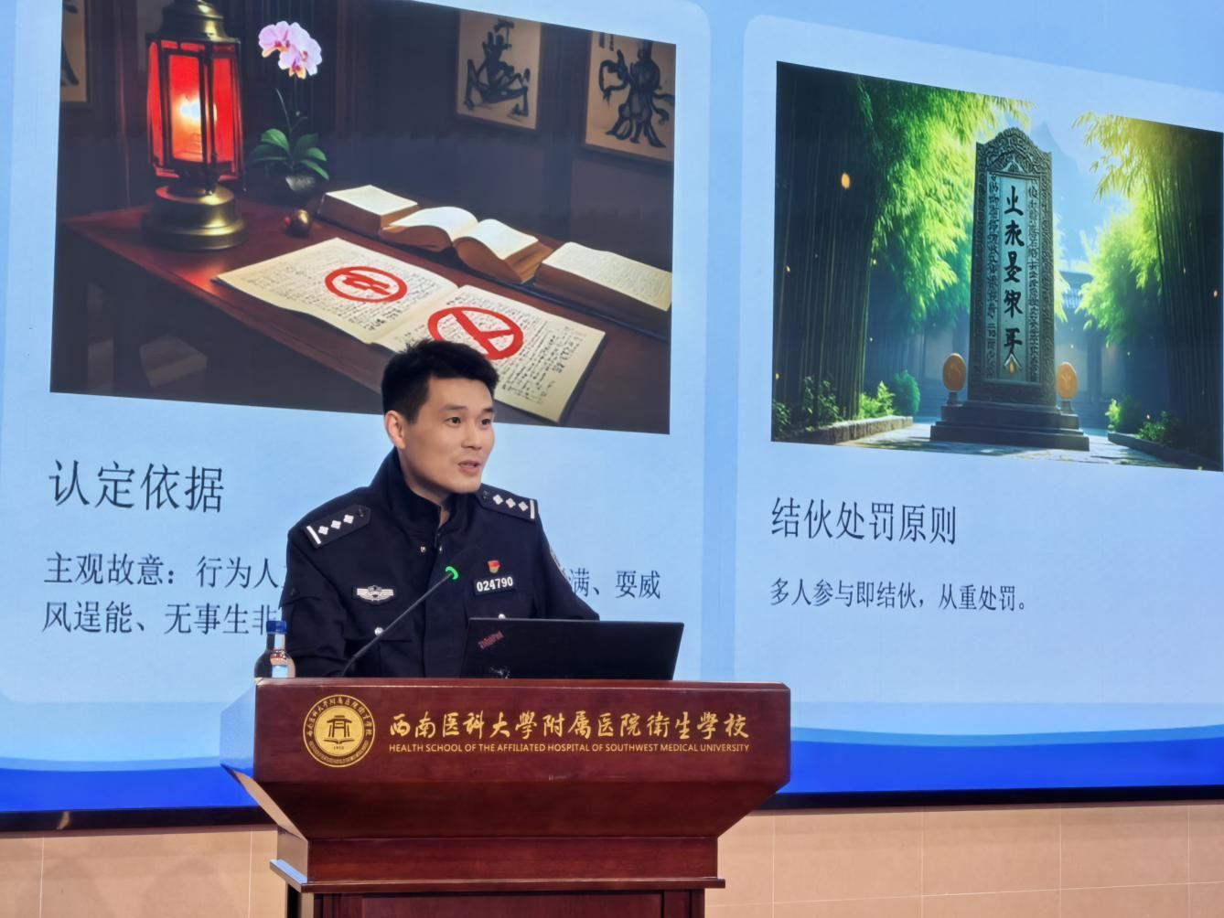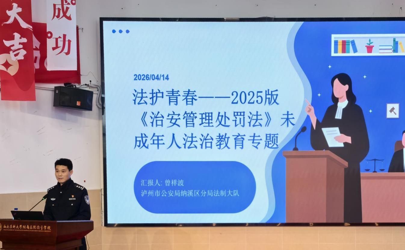 为持续深化警校协同育人,筑牢未成年人法治安全防线,抓实校园普法警示教育,4月14日下午,我校特邀泸州市公安局纳溪区分局法制大队副大队长、我校法治班主任曾祥波警官,开展2025新版《治安管理处罚法》未成年人专项法治宣讲,各班级学生代表参会学习。